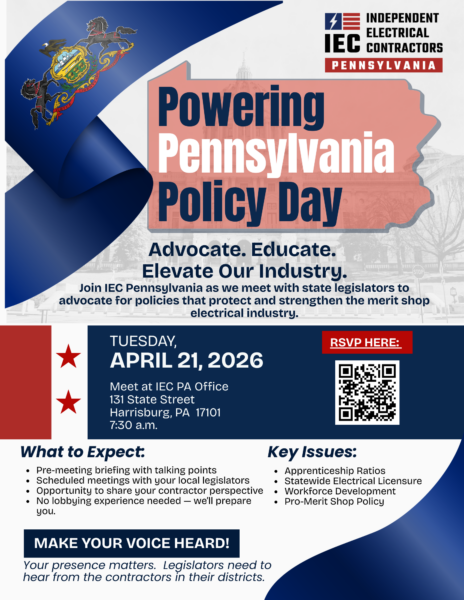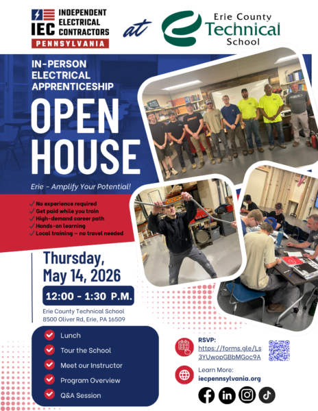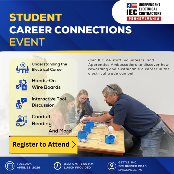 EVENTS 21 April 2026 Powering Pennsylvania Policy Day IEC PA Office, Harrisburg, PA 28 April 2026 Career Exploration Event – York County Gettle, Inc., Emigsville, PA 04 - 06 May 2026 2026 IEC Policy Conference Washington, D.C. 14 May 2026 Graduation Northwestern/Western PA Nick's Place, 12246 Route 99, Edinboro, PA 16412 14 May 2026 Erie Open House Erie County Technical School, Erie, PA 28 May 2026 Graduation South Central/Eastern PA The Central Hotel & Conference Center Harrisburg 18 June 2026 Golf Outing Grandview Golf Course, York, PA 13 August 2026 Back to School BBQ – Northwestern PA TBD 14 August 2026 Fishing Tournament Lake Erie 20 August 2026 Back to School BBQ – South Central PA TBD 22 - 24 October 2026 SPARK 2026 Columbus, OH No event found!
